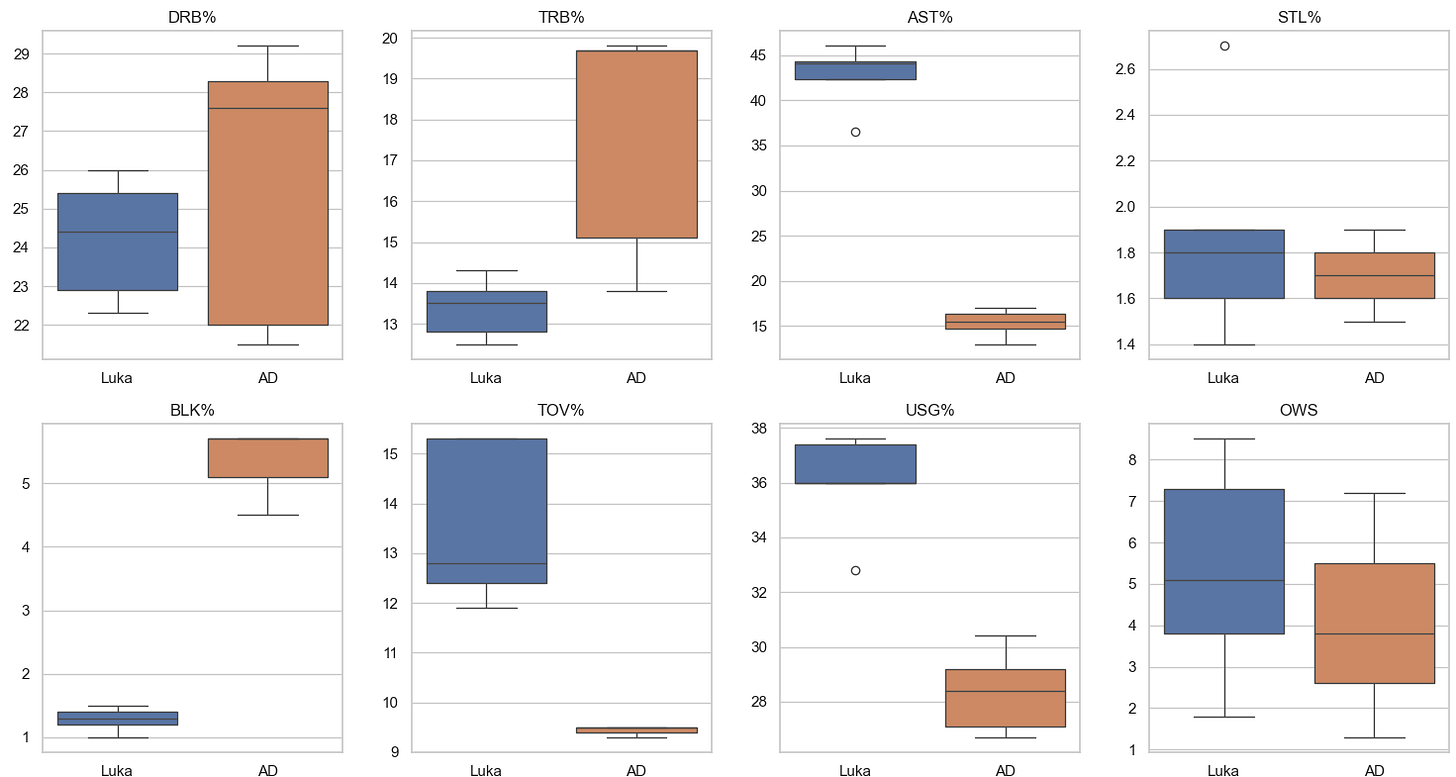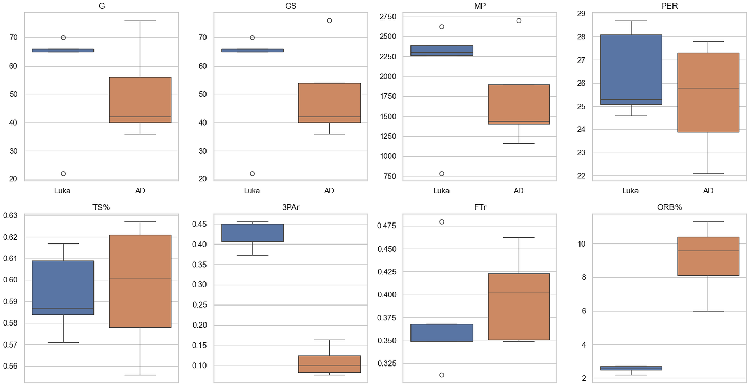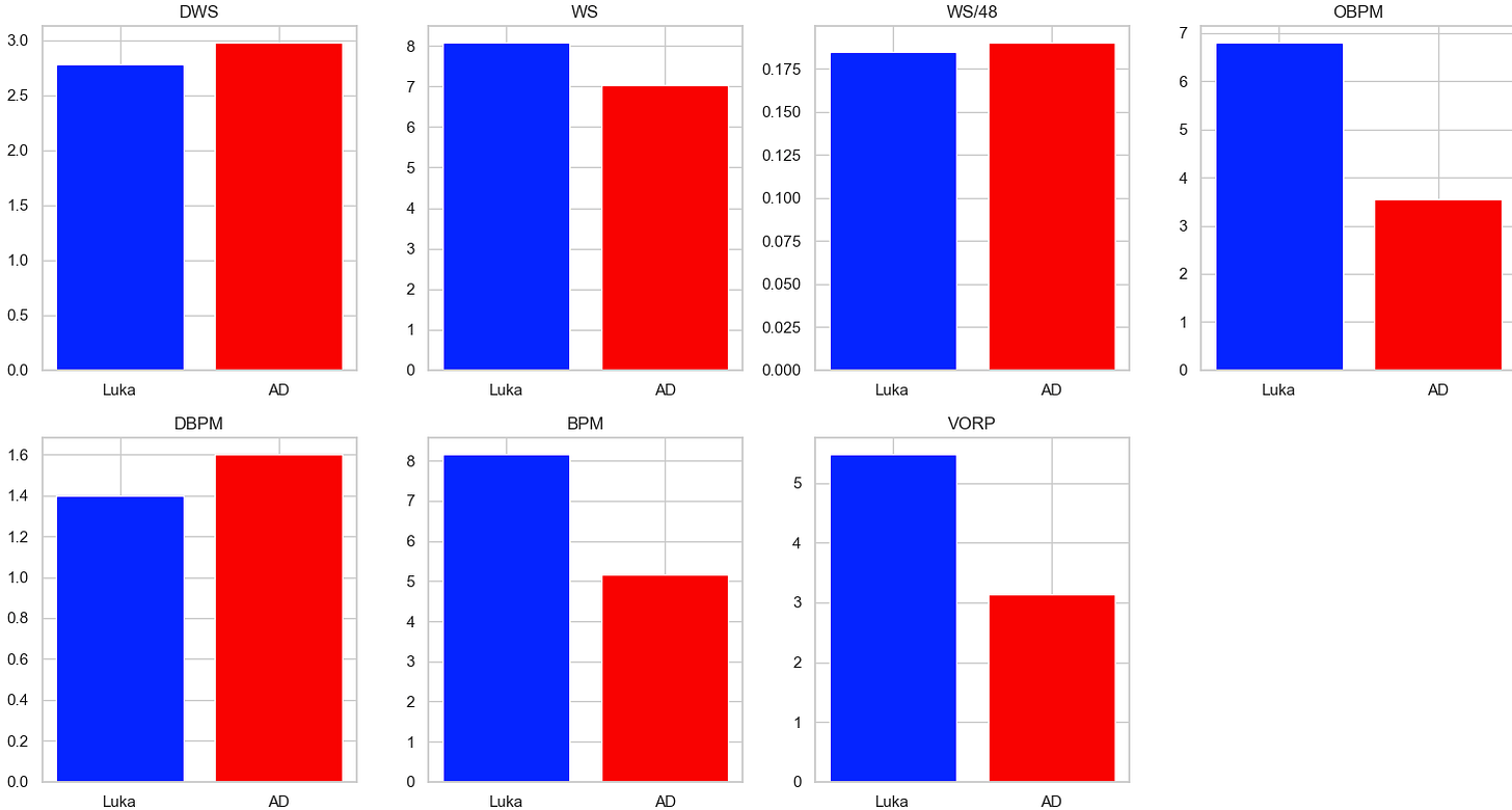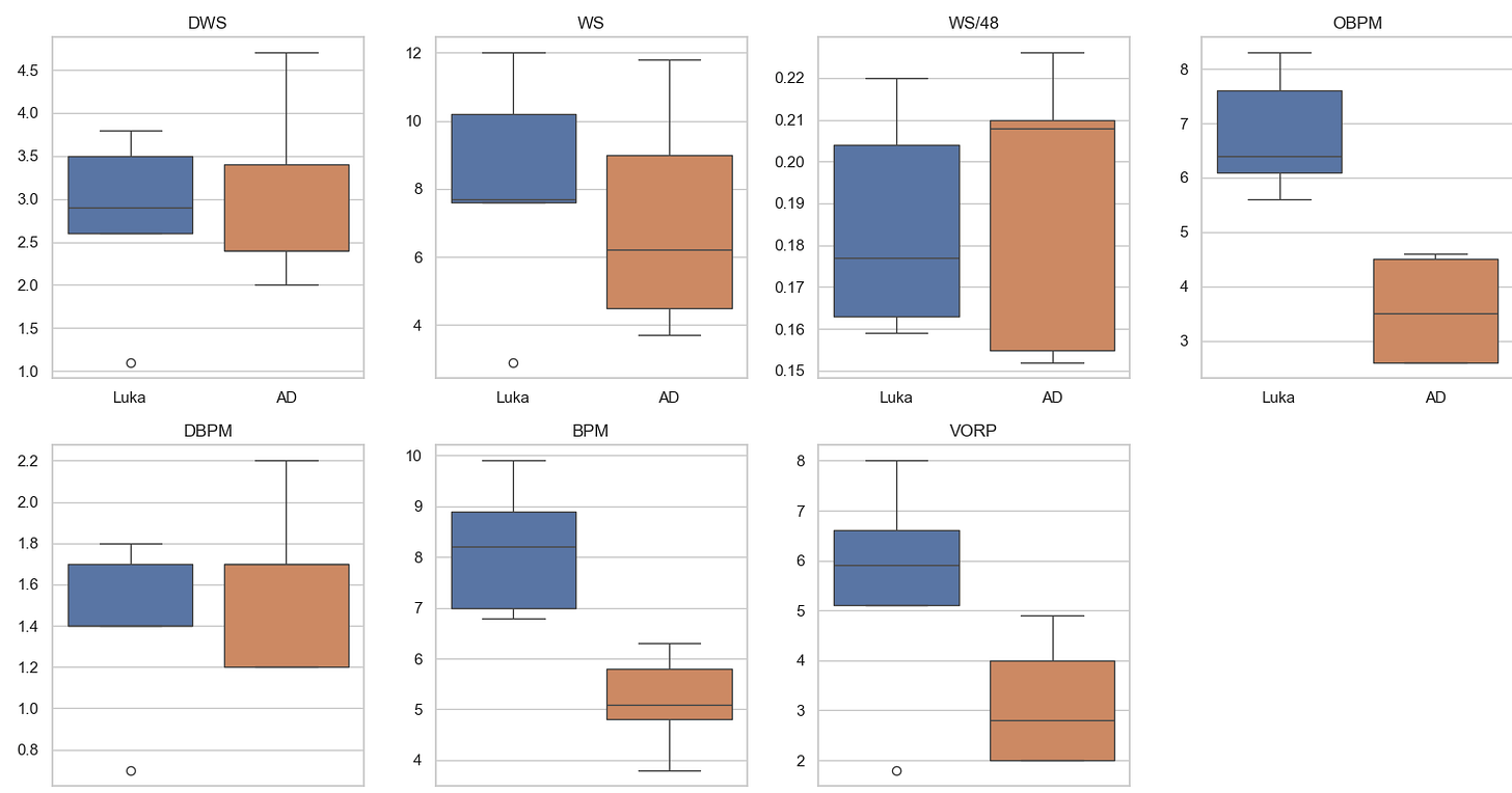 Luka’s advanced statistical metrics are, for the most part, better than AD’s. Luka is much more consistent, as seen by the lack of variance in games played, more consistently high VORP and WS ratings, and overall better statistics in impact and counting stats. The box plots were especially telling where in all of the impact stats Luka rated higher and his plot had much less variance than AD’s signifying Luka’s consistency year by year. While the statistics and visualizations show the dominance of Luka, we must acknowledge stats aren’t everything, and on-court fit will be a big component in evaluating the trade moving forward